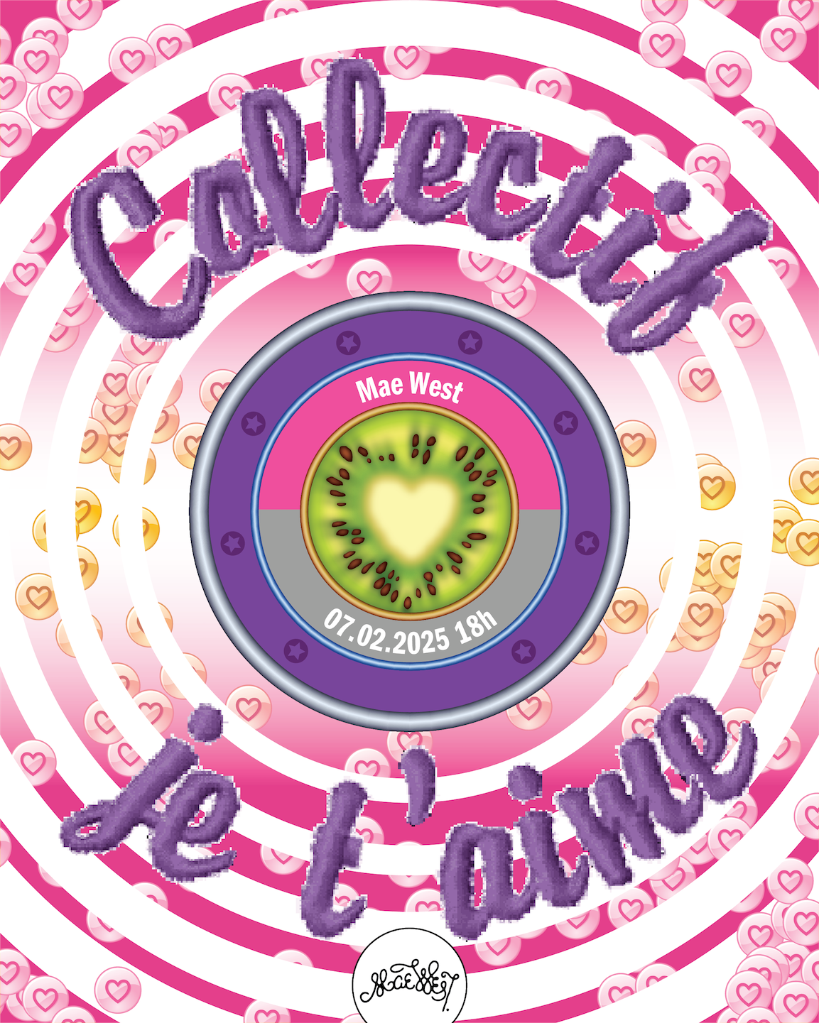 Poster for Mae West's first exhibition, Collectif Je t'aime, on February 7th, 2025.