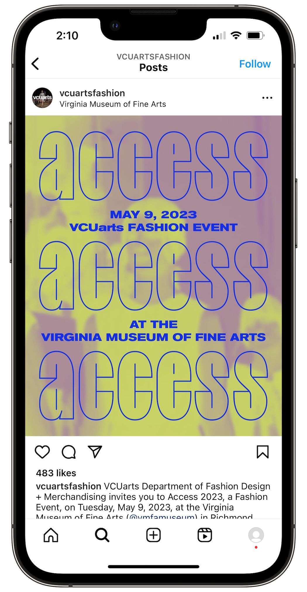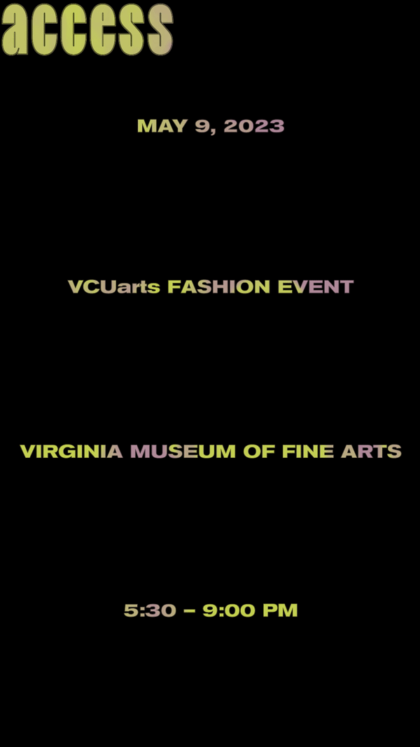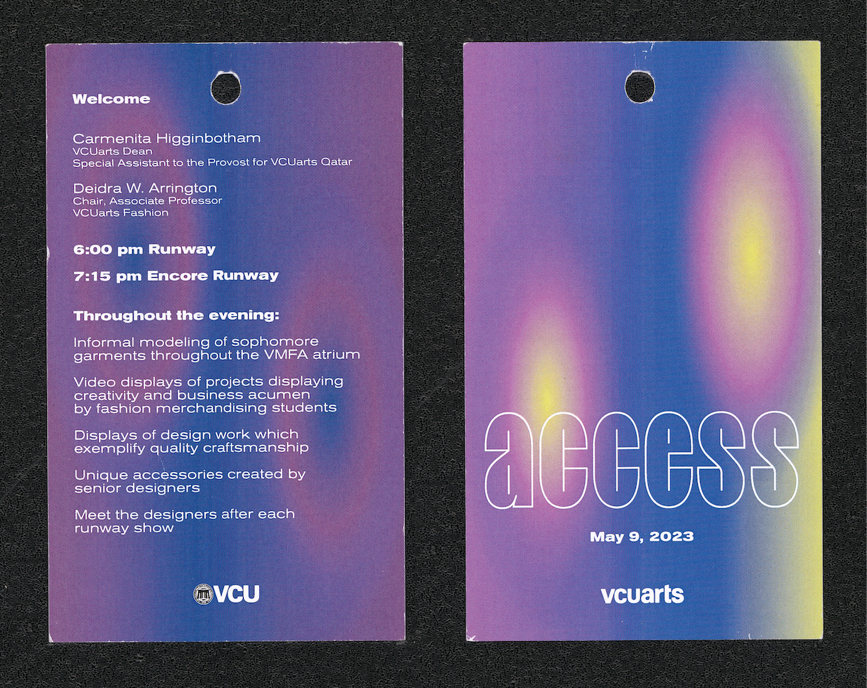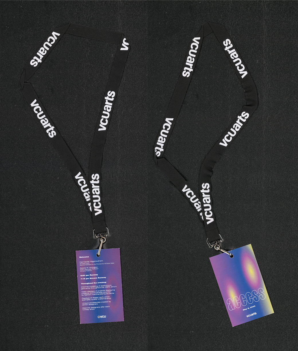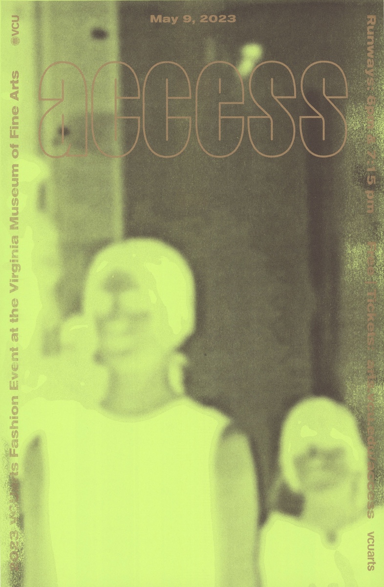 The VCUarts Department of Fashion Design + Merchandising holds an annual juried event showcasing students' most exceptional work; the theme for 2023 was "access." JL Impact Nieuw 2022 Silver Lining, a hollow, stroke-only typeface, was chosen to emphasize negative space and uses this quality to represent the barrier between an individual and access, or "permission to explore." The identity also draws from surveillance and thermal camera imagery, manifesting in the purple and green gradient map used throughout. The goal was to give attendees the sense that access to the event is exclusive, something they personally have been granted.