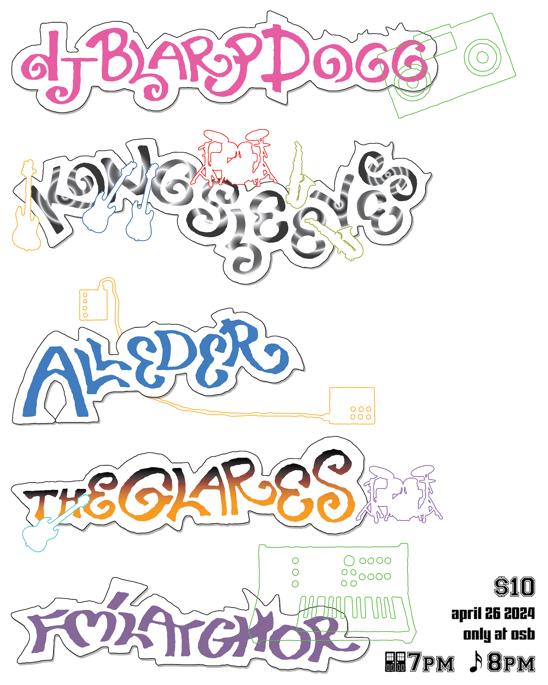 Flyer for a music event in Richmond, Virginia at O.S.B. on April 26, 2024. Main type drawn in collaboration with Leif Siegrist.
