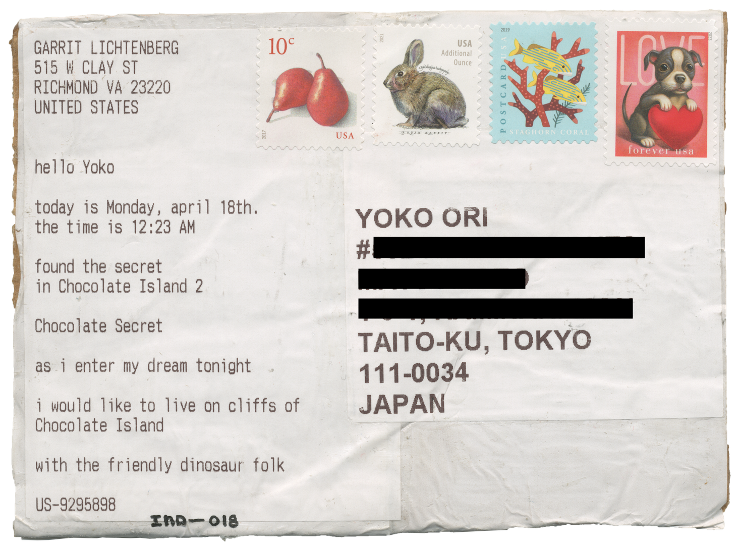 Postcard to Yoko Ori in Japan