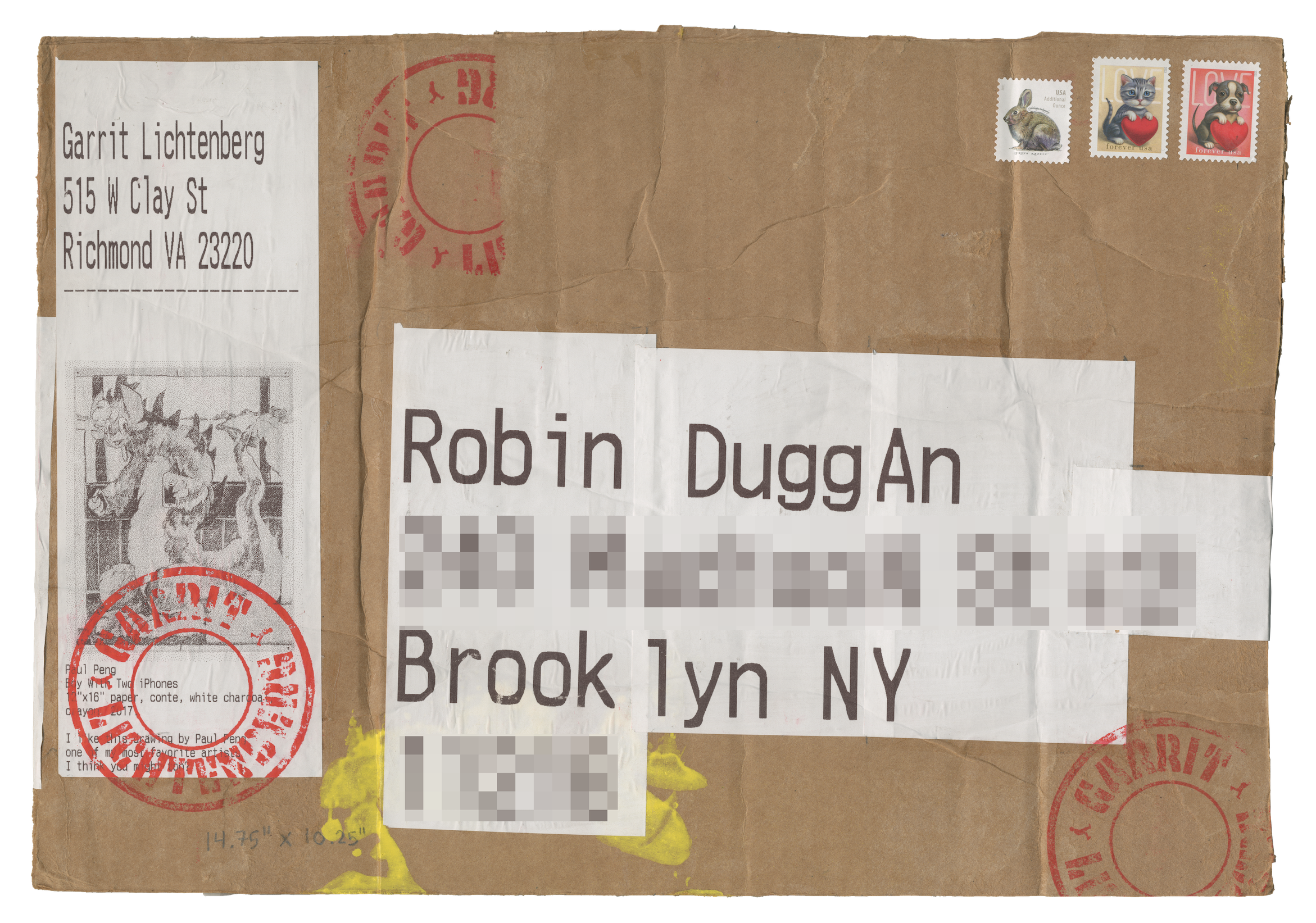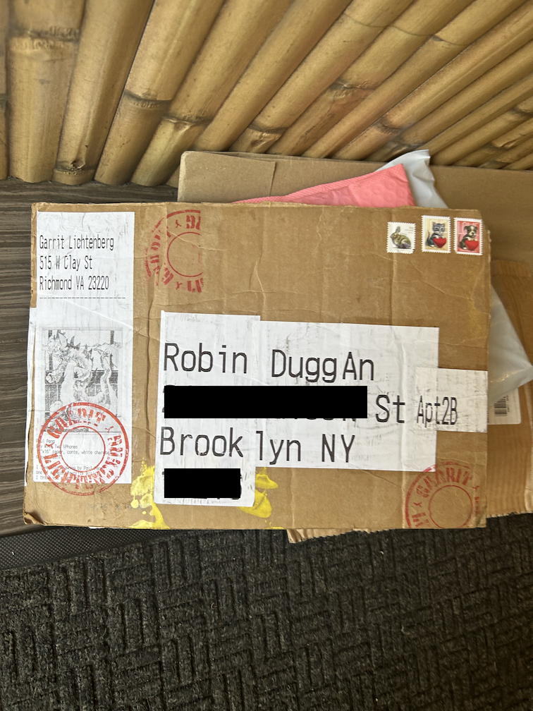 Jumping Out of the Box Mailpiece for Robin Alvare Apr 2023 oversize cardboard postcard 14.75" x 10.25" tags: mail thermal printing